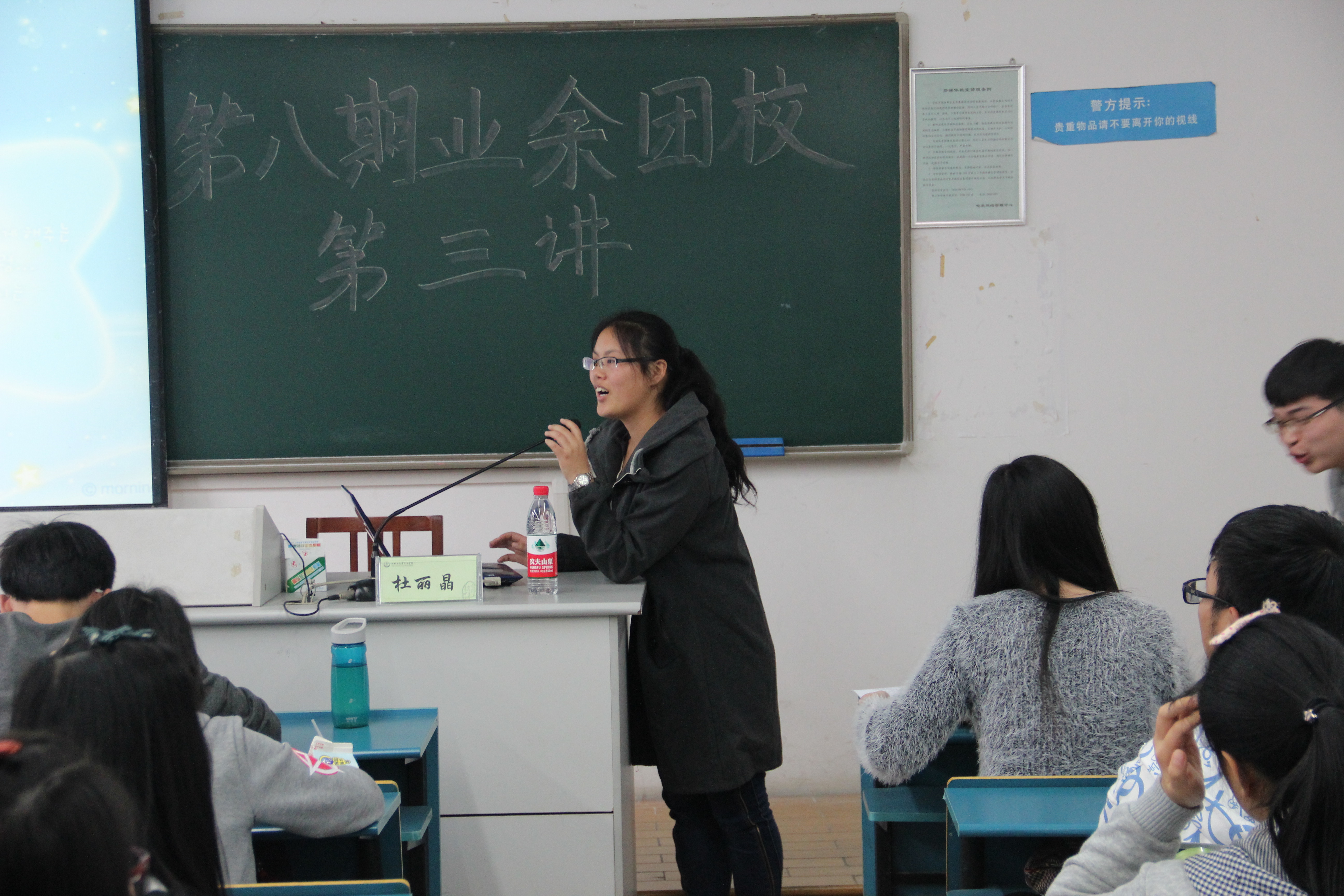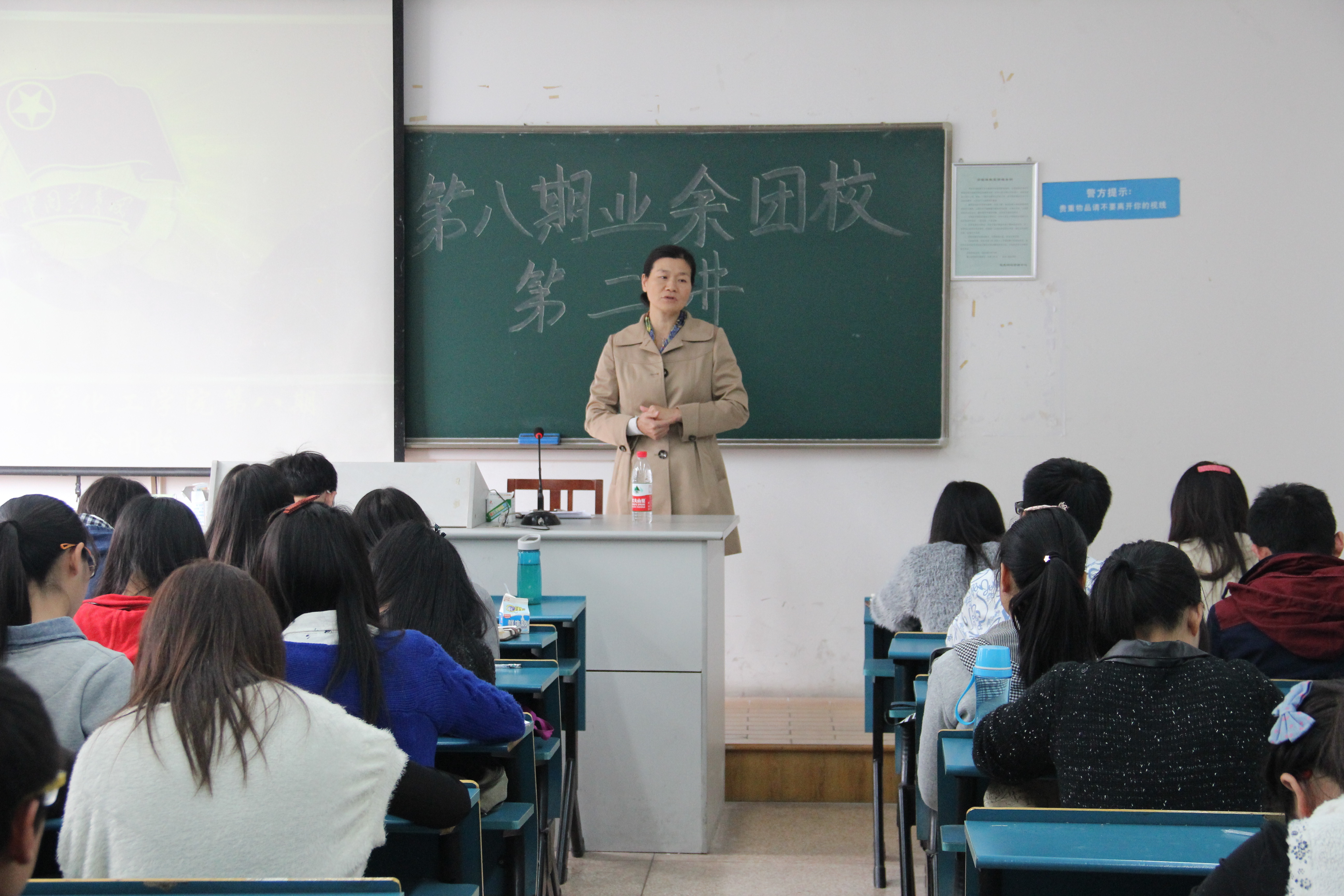 第八期业余团校第二课和第三课在B楼215教室进行。党委副书记何丽君应邀担任第二课主讲人,第三课则由学生干部代表林胜和杜丽晶授课。