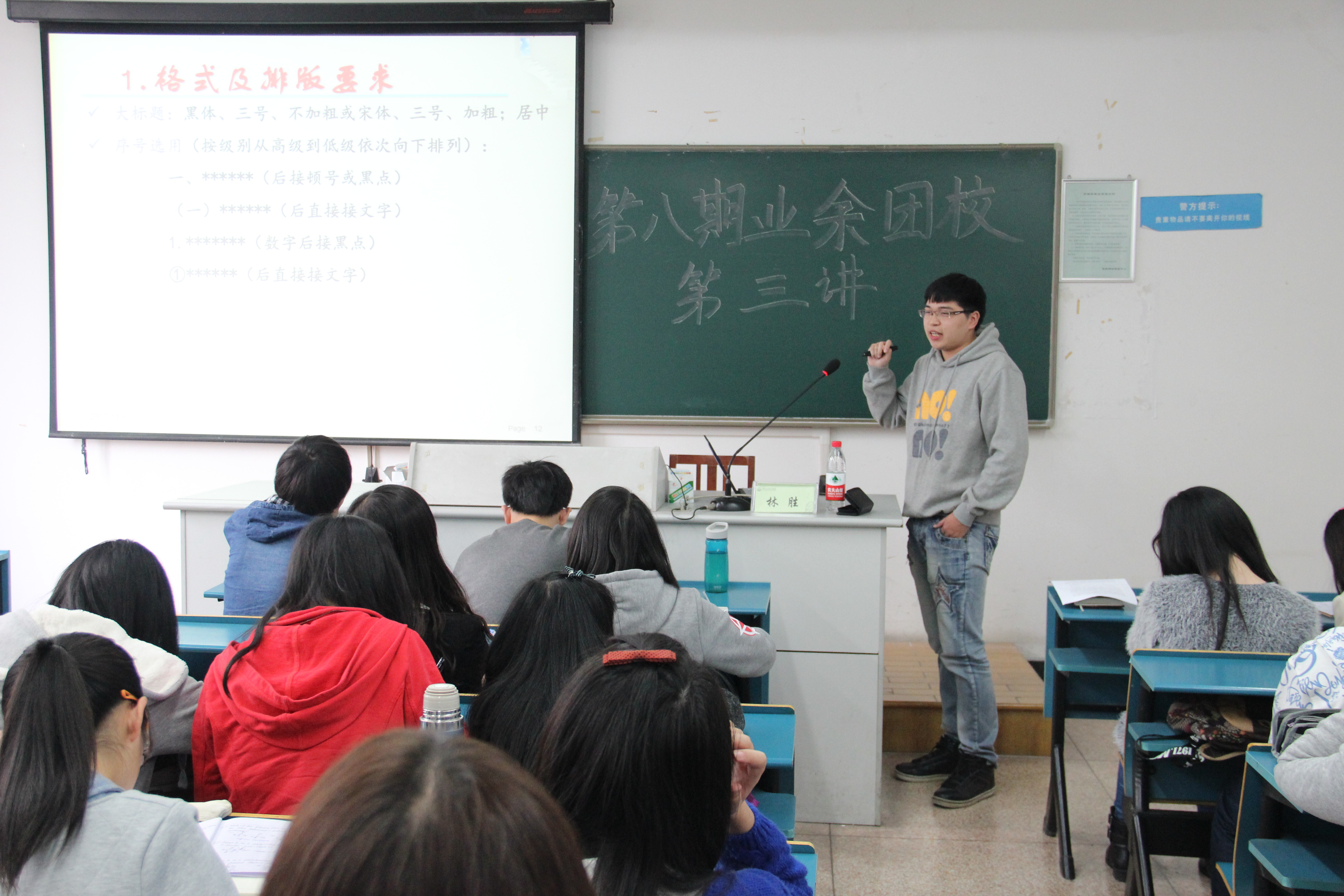 在短暂课间休息后,第三课准时开课,本次团课以优秀学生干部为主讲人,他们为同学讲解工作中的具体方法。其中林胜为全体在座同学详细讲解了如何写策划稿,包括写策划稿过程中的注意事项和技巧等。之后,杜丽晶为大家讲解了新闻稿的写作要点与注意事项。二位同学讲得头头是道,妙趣横生。