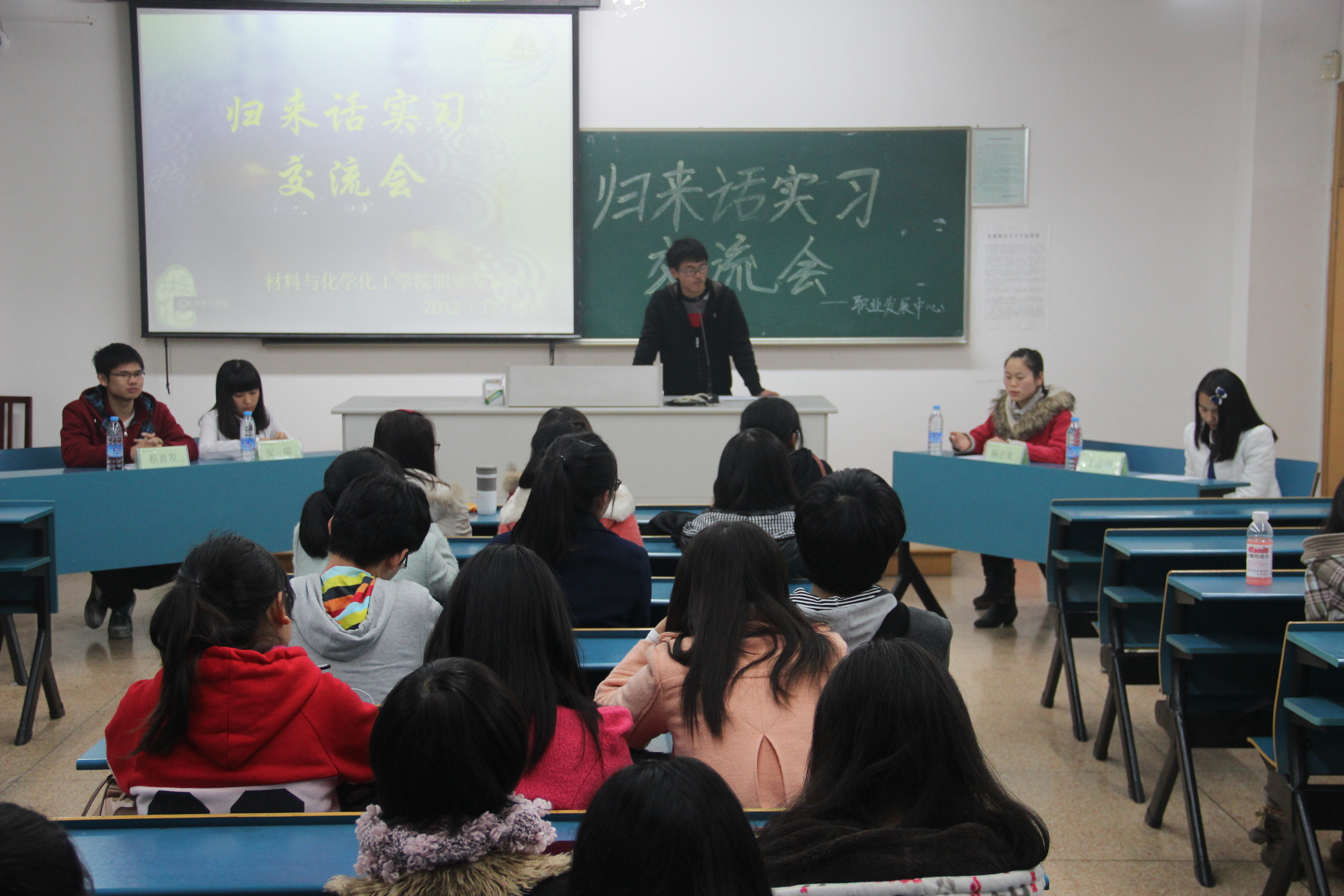 在主持人吴士泸宣布活动开始后,高分子101班的蔡喜发、制药101班的安瑞、化师101班的王晶瑾以及应化101班的杨正美各自分享了他们宝贵而丰富的实习经验以及现在的求学就业情况。另外,他们就就业实践信息、考研经验进行了详细解说。
