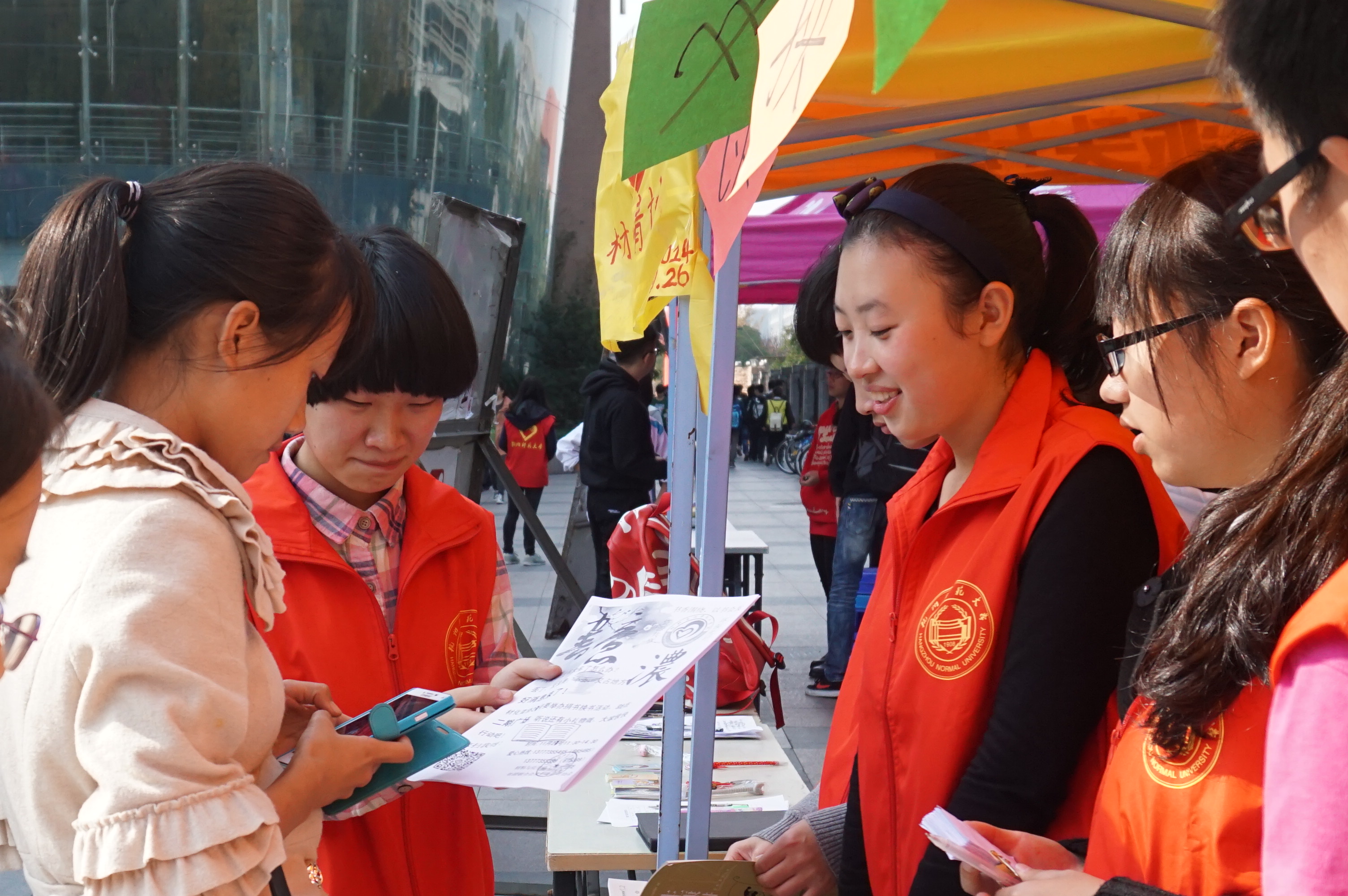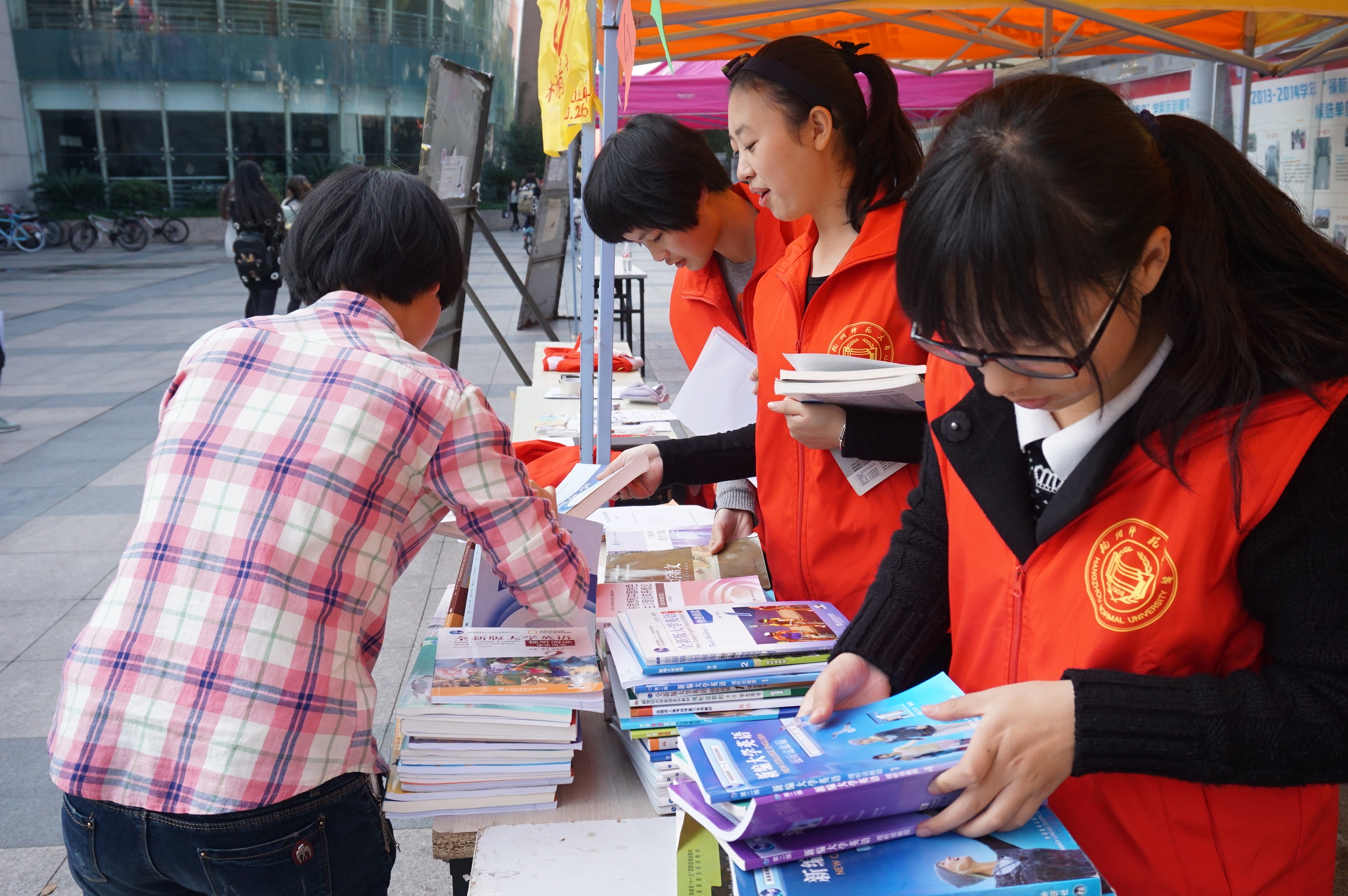 在活动开始前一个小时,志愿者就开始了准备工作,包括桌子海报的搬运,活动现场的装饰以及小礼品的挑选。志愿者们的明确分工,保证了此活动的有序进行。在活动期间,不少路过现场的同学都对“以书换书”活动表现出了极大的兴趣,他们拿着“换书凭证”在众多书籍中挑选自己喜欢的书,并主动扫二维码关注材化青协的微信号。此外,志愿者们则在广场中向参与者介绍活动的开展以及详细地讲述活动的意义。每当有同学来换书台询问,志愿者都不厌其烦地向他们展示一列列分类明确的书籍。并且为了感谢一些热心的同学直接捐出自己不用了的书,青协还赠送了一些精美的小卡片作为答谢。