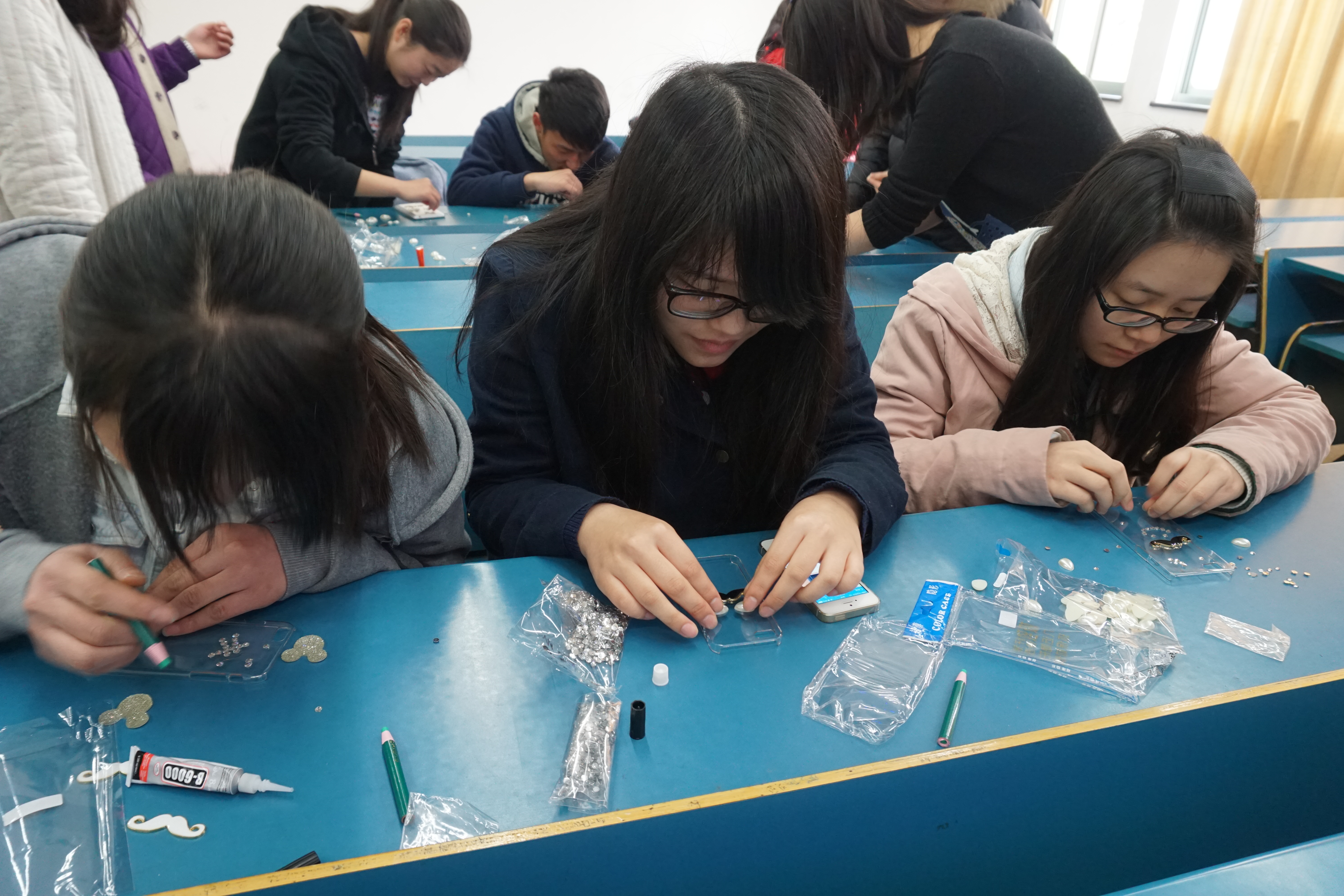 活动伊始,灵创干事邢正召集会员们集中在一起,在确认了各自的手机型号后,让工作人员为每个会员分发相应的手机空壳和手工材料,各式各样的材料瞬间吸引了大批会员的目光。一切就绪后,刑正为会员介绍了各种工具和材料的基本使用方法。随后,会员们跃跃欲试,借着大家积极参与的热情,活动现场立刻活跃起来。在DIY过程中,在场的同学们互帮互助,积极交流,各种绚丽又富有创意的作品在会员的努力下逐渐成型,同学们对自己作品的满意也溢于言表。活动的最后,灵创作空间为会员作品进行了拍照留影,宣告着本次活动的圆满结束。