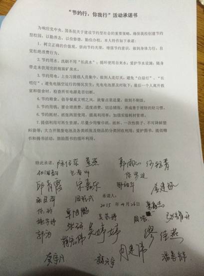 每一位同学在认真阅读“节约型,你我行”活动承诺书的每项内容后,签上了自己姓名,承诺在今后生活中崇尚节俭,以实际行动为创造节约型校园贡献自己的一份力量。光盘行动中同学们以拍照的方式将自己的“光盘”保存下来。拟写的节电小方法特别针对于寝室用电浪费的现象,如不用热水器时,把插头拔掉,手机电脑电充满之后及时断开等,通过这些实用、可操作性强的方法,为各寝室省下不少的电费。拟写节约标语活动中,在集思广益下出现了很多或新颖,或响亮,或引人深思的标语,如“我光盘,我光荣”;“节约不以微小而不为,浪费不以量小而为之”;“花是四舍,节是五入”等。
