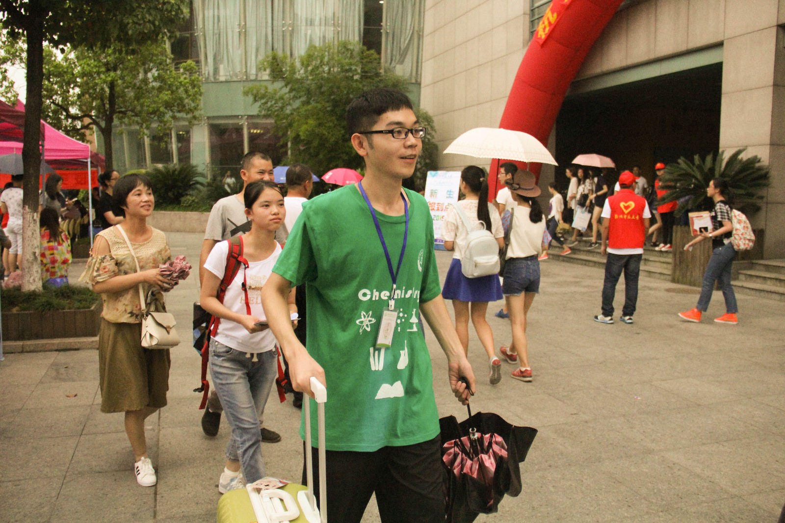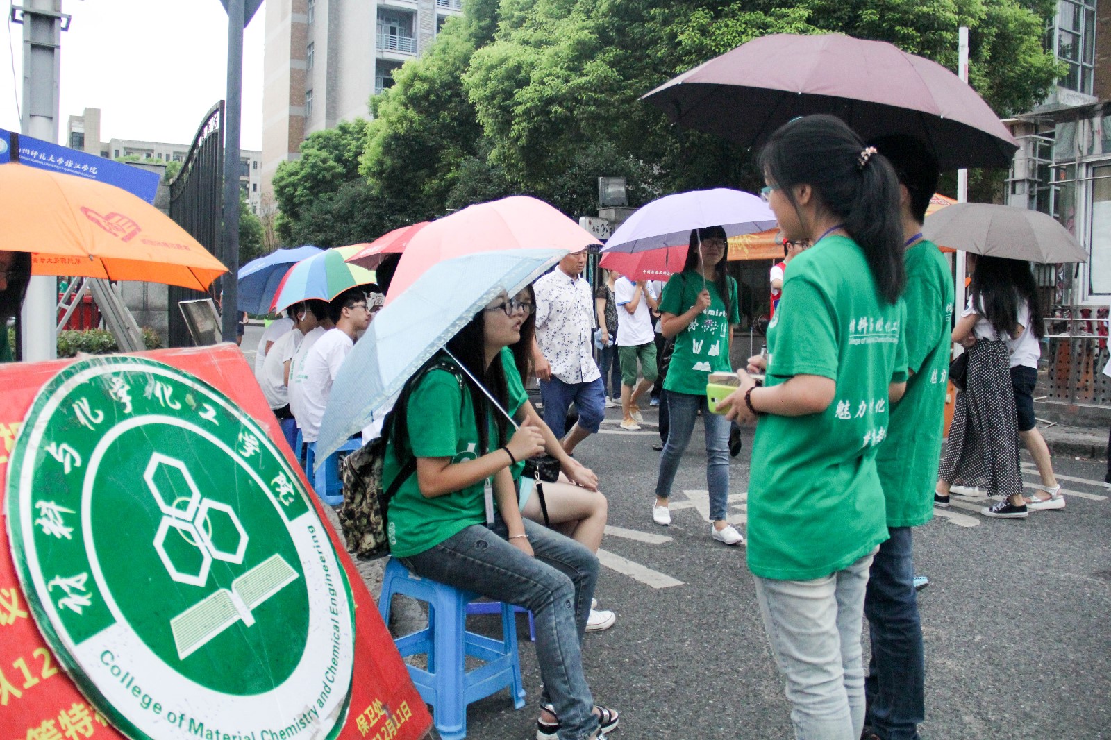 材化的绿色,在今天成为了师大校园内一道靓丽的风景线。大学生会的志愿者们身着绿色院服,分散在了正门、侧门、报到点和展示橱窗等各个角落,时常可以看见博彩网 志愿者们帮助新生拎着大包小包,穿梭在各幢寝室楼之间。为了让新生在入校的第一天就感受到来自学校以及博彩网 的关爱,即使偶尔会瞥见家长们质疑的目光,即使天公不作美地下着雨,但志愿者们始终坚守在自己的岗位上,带着一颗充满热情的心,让材化之绿显得格外耀眼和温暖。