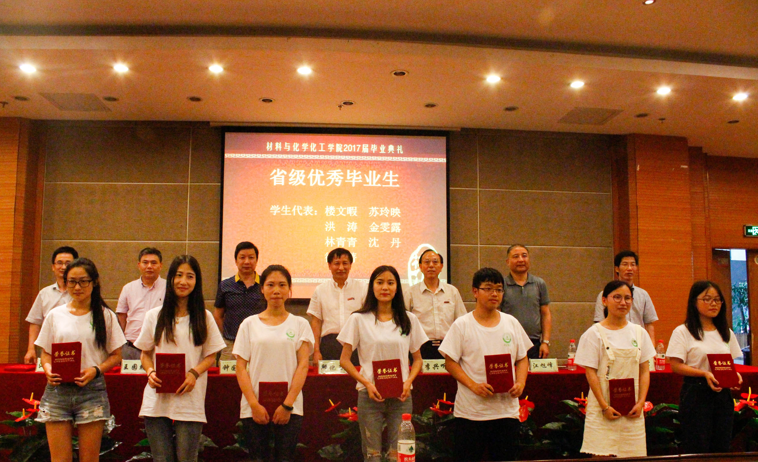 钟国富教授作为教师代表做了讲话,他给毕业生们提出三点建议:努力工作、不要骄傲、坚持真理,并提醒同学们在接下来的人生道路上保重身体、心情快乐,做出一番事业。班主任代表王莲老师也向毕业生们做了临别嘱托,她希望大家把大学时的美好回忆铭记心间,踏踏实实工作,开开心心生活,待来日辉煌时再相聚。校友代表江旭峰也做了热情洋溢的发言,他回顾了自己在校时的美好时光,期待学弟学妹们完成从被动到主动的转变,怀揣一颗真诚的心,面对未来的生活,作出一番事业,成就精彩人生。研究生代表王巧丽和本科生代表陈佳苗作为毕业生代表发言,他们的发言充满了对母校的眷恋与对老师同学的感激之情,也展示了勇面未来、开拓进取、为母校增光添彩的决心。随后,到场领导为省级、校级、院级优秀毕业生颁发证书。