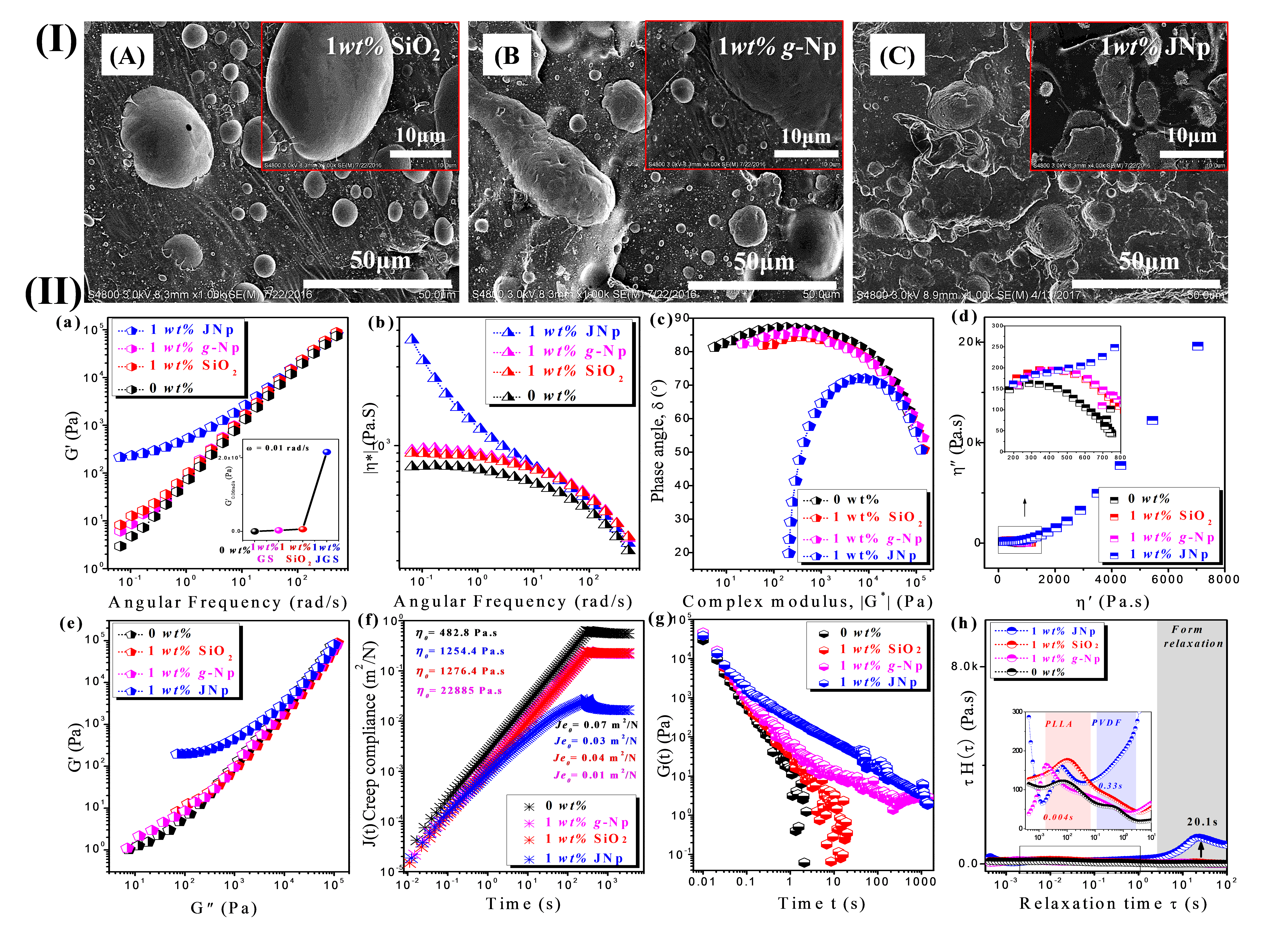 图2.“界面纳米粒子”增容不相容聚偏氟乙烯(PVDF)/聚乳酸(PLLA)的微观形貌(I)及其流变响应测试(II).