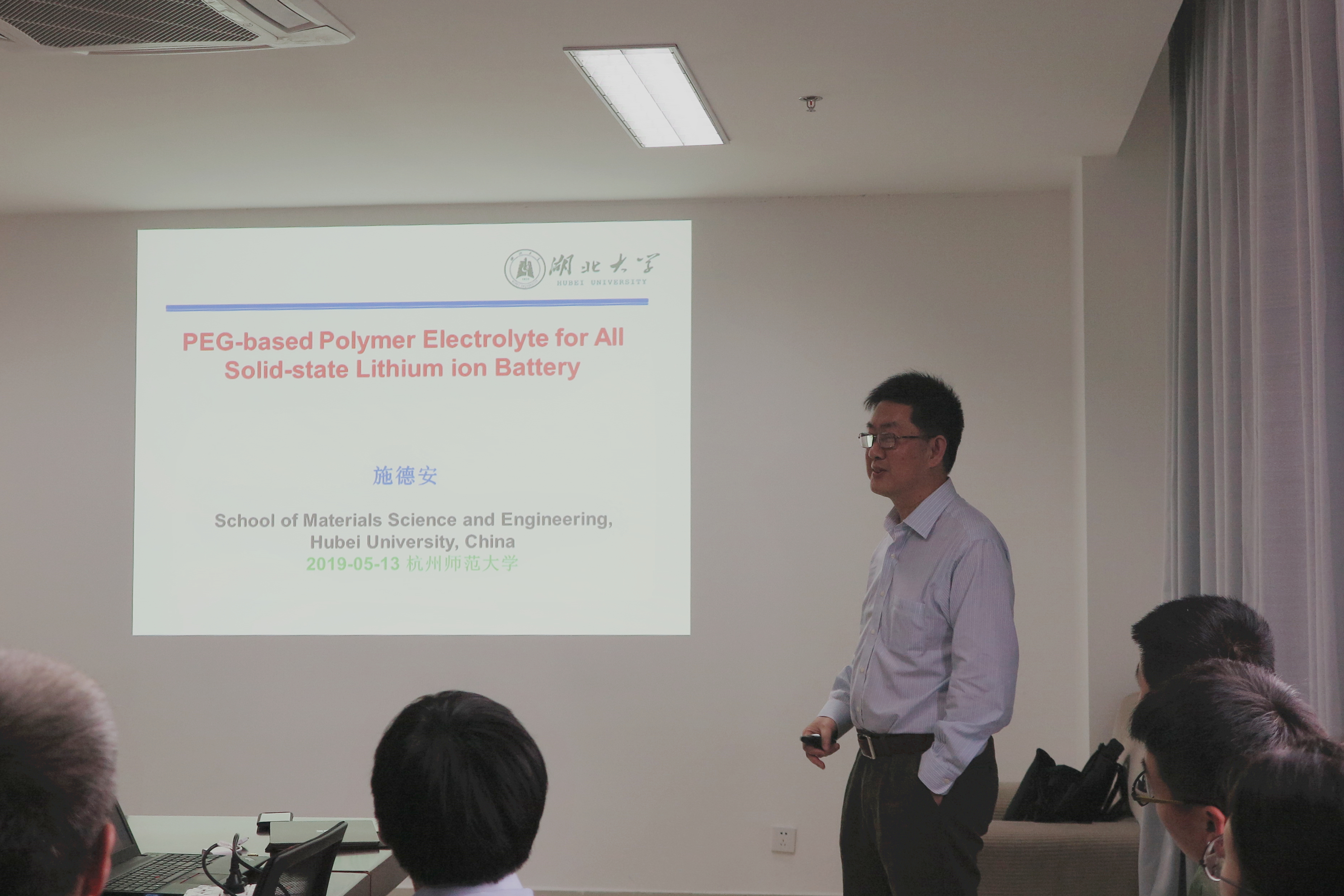 此次报告中,施德安教授主要向我们介绍了聚乙二醇基锂离子电池的固态聚合物电解质,为我们讲述了聚乙二醇网络合成的过程并且将全固态电解质的制备以及电池性能表征过程中的关键细节展现在广大师生面前。施德安教授将非常专业的内容在我们面前徐徐展开,赢得了在座师生的掌声与赞美。