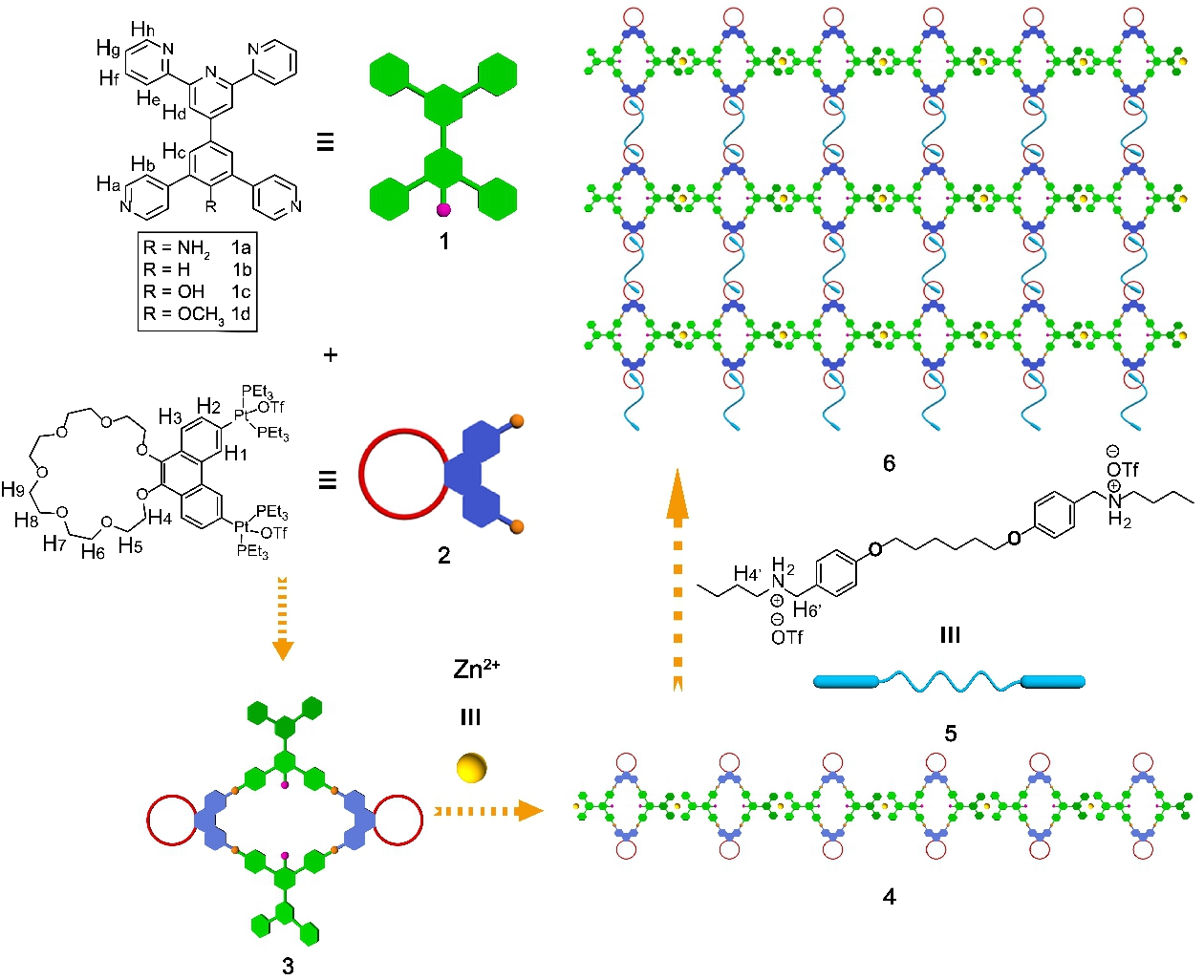 超分子聚合物是以非共价键力作为连接桥梁,将超分子的动态可逆性能引入到聚合物体系当中,赋予了聚合物材料优异的环境刺激响应性,构建了功能繁多的新型智能材料。通过金属配位相互作用可以预设计构建明确几何结构的金属大环化合物,并且过渡态金属自身所具有的特性以及金属配位键之间电荷传递所引起的性质调控等可赋予所形成化合物在包裹与释放、催化、光电材料等方面的应用。论文中,作者首先利用Pt(II)-吡啶配位驱动自组装的提供的一级作用力高效合成了一系列三联吡啶和冠醚修饰的菱形金属大环;其次,作者利用Zn-三联吡啶配位作用力形成线性超分子聚合物;最后,作者利用金属大环上的冠醚与二级铵盐之间的主客体相互作用形成双金属交联超分子聚合物。这三种作用力互不干扰。该交联超分子聚合物在高浓度时可以形成凝胶,其具有热、K+等多重刺激响应性,以及良好的自修复性能。此外,通过改变改变金属大环中吡啶配体的官能团的给电子能力,超分子聚合物发光的性能可实现有效地调控。