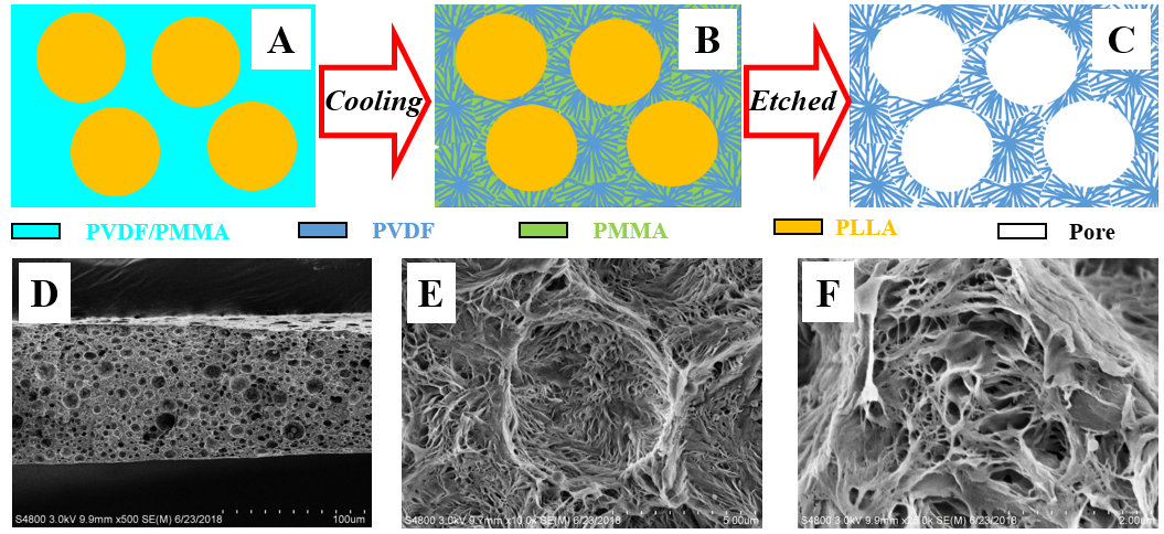 一方面,有限元模拟结果显示,流体在单级孔薄膜(图1 A-B)与多级孔薄膜(图1 C-D)中传质情况具有明显差异,孤立圆孔的存在可以显著缩短传质路径,降低传质势垒,使孤立圆孔之间的流速明显加快。与单级孔薄膜相比,多级孔薄膜的通量可以获得近两倍的提高。另一方面,基于课题组前期发展的“基于结晶排出模板制备多孔材料策略”(ACS Appl. Mater. Interfaces 2015, 7, 12, 6946; Polymer 2018, 142, 48等),研究者采用PVDF/PMMA/PLLA三元共混体系,利用PVDF/PMMA与PLLA之间的相分离构建前者为海相,后者为岛相的“海岛”结构,并在PVDF/PMMA海相中,通过PVDF结晶过程中将PMMA排出的效应,获得二者的纳米级双连续结构,最后,通过选择性溶剂(氯仿)刻蚀,同时去除PLLA及PMMA,成功制备了孤立圆形微米孔和连续狭长纳米孔相结合的多级孔薄膜(图2)。
