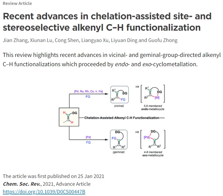 近日,杭州师范大学博彩网 的张坚教授与钟国富教授,凭借课题组近五年来在配位导向下烯烃惰性碳氢键的选择性活化/官能团化研究领域的出色工作,受邀总结了本课题组和国内外同行们在该领域中同碳位和邻碳位碳氢键官能团化反应,包括:烯基化、烯丙基化、烷基化、芳基化、卤化、以及多米诺环化等,并对各种方法的优缺点进行归纳和总结,最后对该领域的发展和应用进行展望。该成果近日以题为“Recent advances in chelation-assisted site- and stereoselective alkenyl C–H functionalization”,在英国皇家化学学会顶级综述期刊Chemical Society Reviews(IF: 42.846)上发表(Chem. Soc. Rev., 2021, DOI: org/10.1039/D0CS00447B, Advance Article)。张坚教授和钟国富教授为该文章的共同通讯作者。