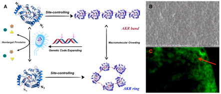 图2 基因水平控制的酶蛋白组装类型示意图(A,组装示意图;B,SEM图片;C, CLSM图片)