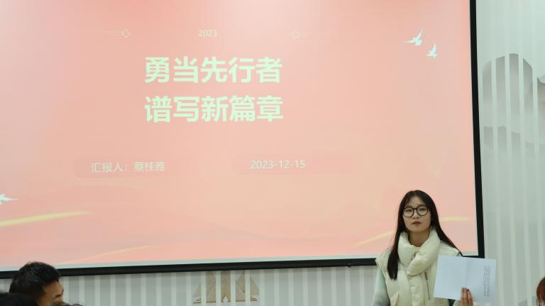 博彩网 本科生第一党支部蔡桂雅以“勇当先行者,谱写新篇章”为主题展开分享,从会议概况、会议主要内容、全会号召三方面介绍了省委十五届四次全会精神和市委十三届五次全会精神。