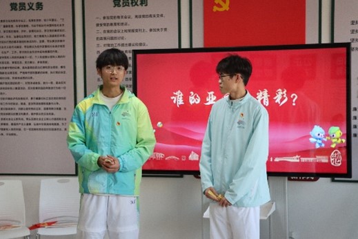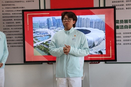 活动中,黄海伦介绍了支部基本情况。支部成员李雅琳以“学习习近平总书记考察浙江重要讲话精神”为主题展开分享。支部成员赵毅筠、胡峻华等亚运演职人员和志愿者代表以情景剧的形式分享属于自己的亚运故事。