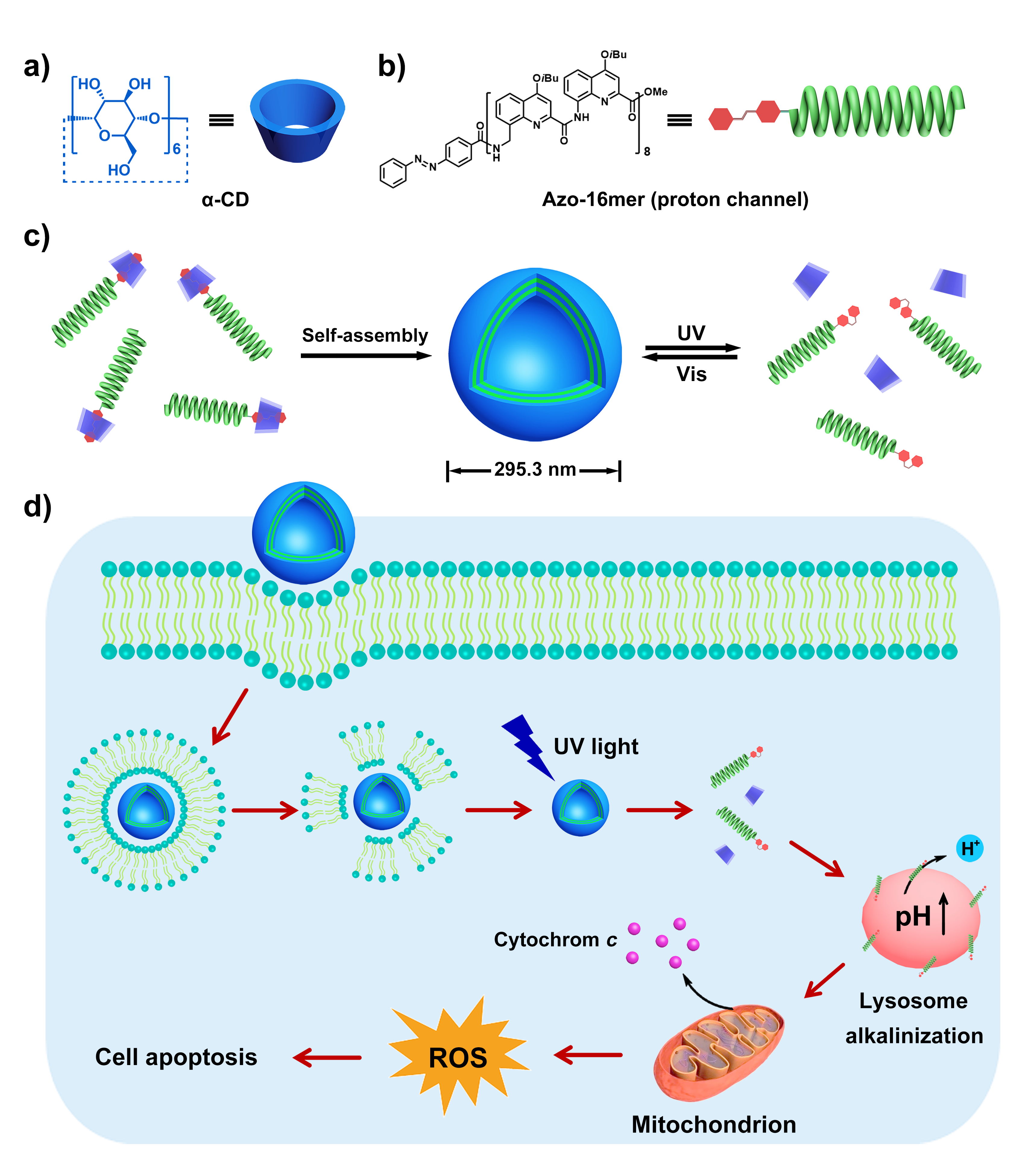针对这一难题,研究团队创新性地设计了一种光响应的离子通道递送系统。该系统核心由一种偶氮苯修饰的喹啉螺旋体(作为人工质子通道)和α-环糊精通过主客体作用自组装形成超分子纳米胶囊。该纳米胶囊可通过内吞作用轻松进入肿瘤细胞,并在紫外光照射下发生解组装,释放出人工质子通道。