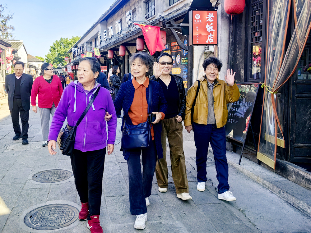 午餐后,老师们前往沈荡古镇。青石板路、明清建筑间,百年酱香与老街烟火气引人驻足。大家或在樟树下畅谈往昔工作岁月,关心校院发展,或品尝特色小吃,在慢生活中重温老友情谊,感受温暖。