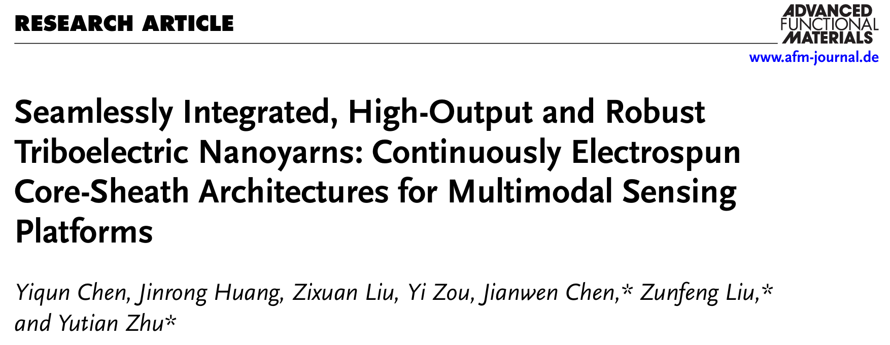 近日,十大博彩评级网 朱雨田教授团队联合南开大学刘遵峰教授,在智能纤维传感与人机交互领域取得新进展。相关成果以 “Seamlessly Integrated, High-Output and Robust Triboelectric Nanoyarns: Continuously Electrospun Core-Sheath Architectures for Multimodal Sensing Platforms” 为题,发表在国际知名期刊 Advanced Functional Materials(2025,影响因子19)上。