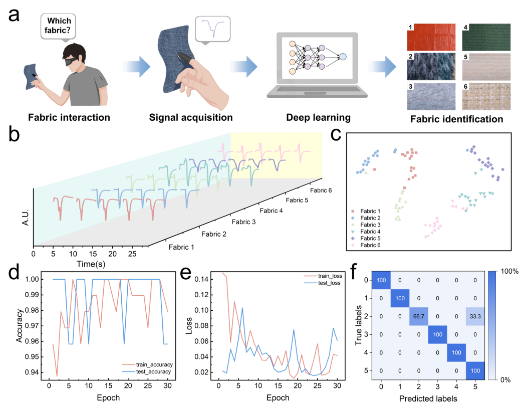 图3. CNY-SE-TENG的应用演示二。a) 织物识别工作流程示意图;b) 六种织物的摩擦电信号特征;c) 从六种织物采集的数据集可视化;d,e) 训练周期内的训练和测试准确率(d)与损失值(e);f) 六种织物识别的混淆矩阵。
