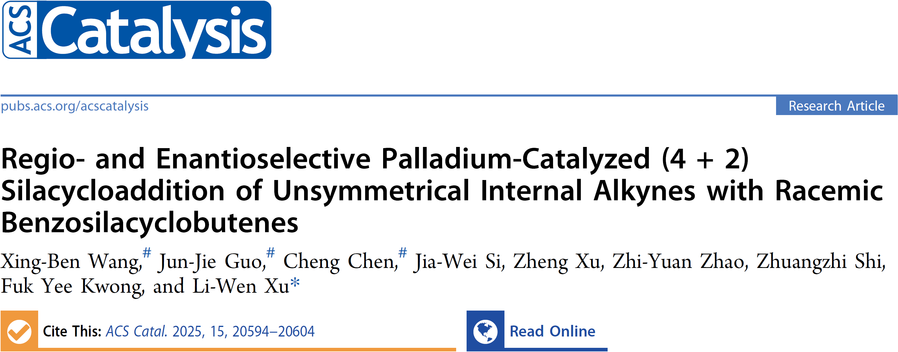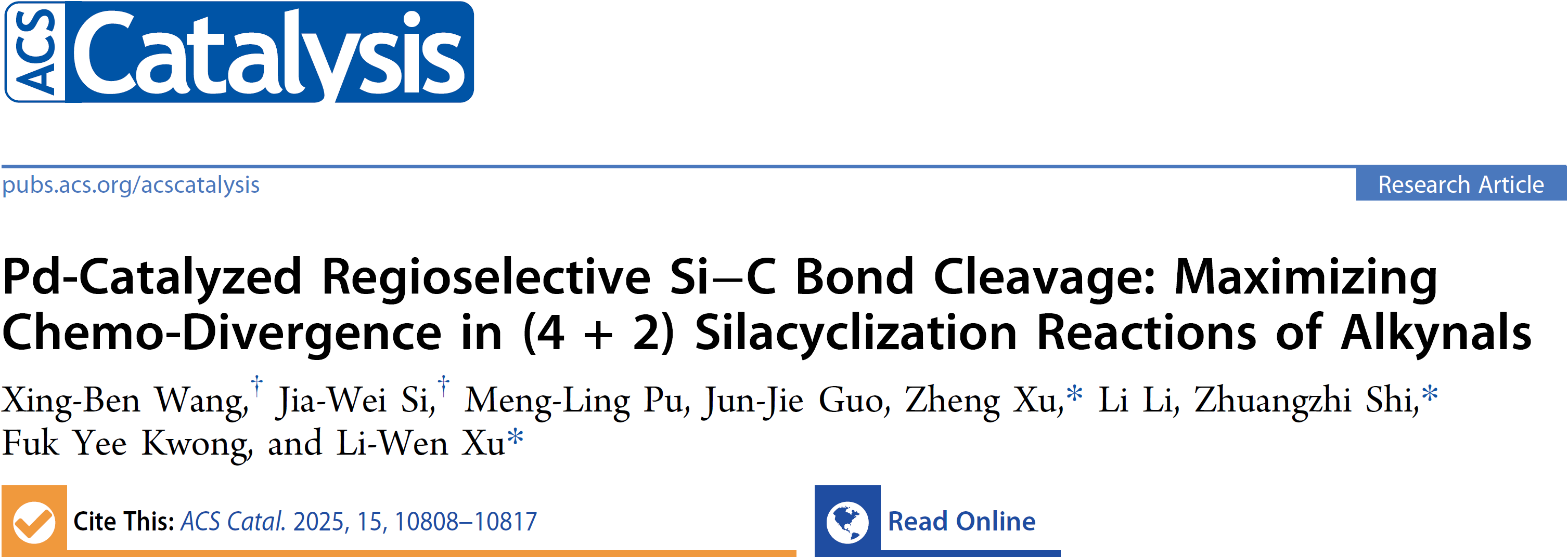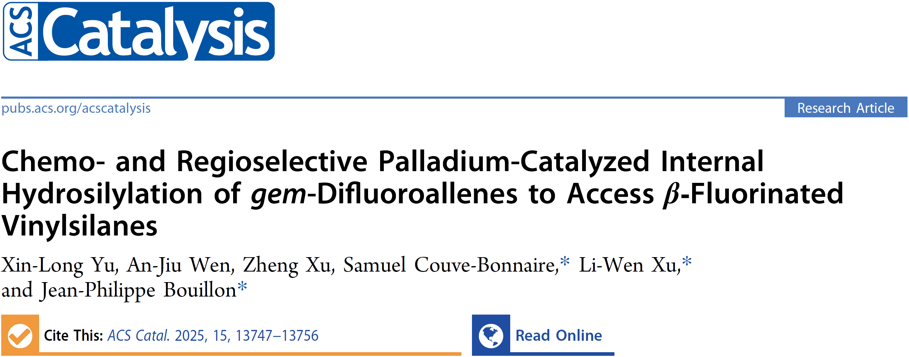 三篇文章均以杭州师范大学徐利文教授为责任通讯作者发表于ACS Catalysis(IF: 13.1,2025)上,其中论文Pd-Catalyzed Regioselective Si−C Bond Cleavage: Maximizing Chemo-Divergence in (4 + 2) Silacyclization Reactions of Alkynals的第一作者为我校博彩网 和南京大学联合培养博士后王星犇,2023级硕士研究生斯嘉伟,杭州师范大学徐利文教授和徐征教授,南京大学史壮志教授为该论文的共同通讯作者论文;Regio- and Enantio-selective Palladium-Catalyzed (4+2) Silacycloaddition of Unsymmetrical Internal Alkynes with Racemic Benzosilacyclobutenes的第一作者为我校博彩网 和南京大学培养博士后王星犇,2024级硕士研究生郭俊杰,2024级博士研究生陈城,杭州师范大学徐利文教授为该论文的唯一通讯作者论文;论文Chemo- and Regioselective Palladium-Catalyzed Internal Hydrosilylation of gem-Difluoroallenes to Access β‑Fluorinated Vinylsilanes的第一作者我校博彩网 与法国诺曼底大学联培2023级博士研究生余鑫龙,杭州师范大学徐利文教授,诺曼底大学Samuel Couve-Bonnaire教授和Jean-Philippe Bouillon教授为该论文的共同通讯作者论文。以上研究成果获国家自然科学基金、浙江省自然科学基金、杭州师范大学创新交叉团队等项目资助。