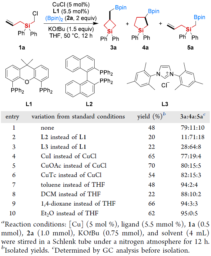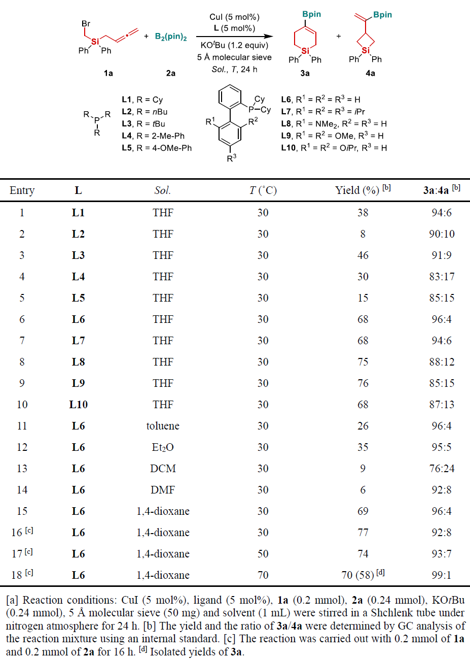 该团队以氯甲基烯丙基硅烷1a与联硼酸频哪醇酯2a为模型底物,开展了系统的反应条件筛选。研究发现,以 CuCl 为催化剂、XantPhos 为配体、KOtBu 为碱,在乙醚溶剂中50 ℃反应12小时,能以62% 的分离产率和95:5的区域选择性得到四元环产物3a。催化剂种类、配体电子效应及溶剂极性对反应结果影响显著,其中乙醚作为溶剂能有效抑制异构体五元环产物4a和开链产物5a的生成,保障优异的区域选择性。