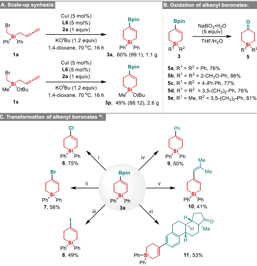 为验证方法的实用性,首先,团队完成了目标产物3a和3p的克级规模合成。其次,利用产物中的烯基硼酸酯基团的丰富衍生化潜力,经氧化反应合成了4-硅环己酮;经氯化、溴化、碘化反应制备了相应的卤代硅环己烯;通过脱硼反应能获得了烯烃产物;通过Suzuki-Miyaura 偶联反应将其与碘苯、烯基溴和雌酮衍生物构建结构复杂的硅环化合物。这些转化反应充分展示了硼酸酯官能化硅杂环在有机合成反应中的应用潜力。